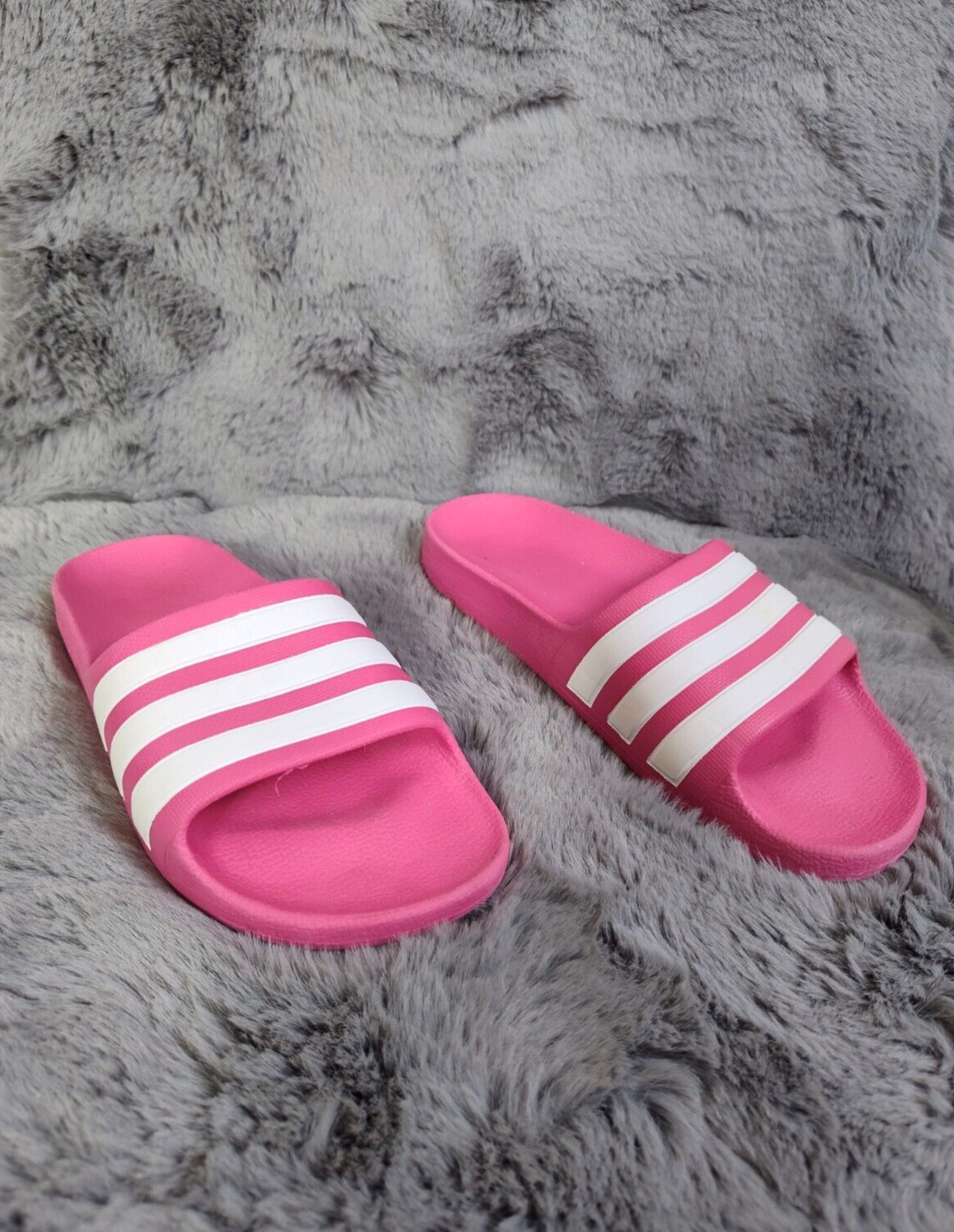Adidas Girls Adilette Sandals 3K Pink Striped Slide Casual Comfort Flat Shoes