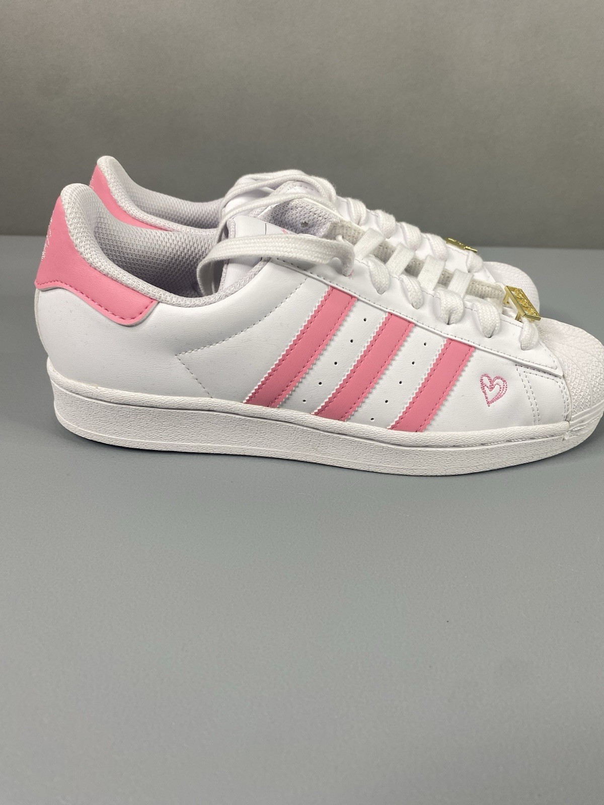 Adidas Superstar J Girls Size 7 White Pink Heart Gold Accent Sneakers IG2749
