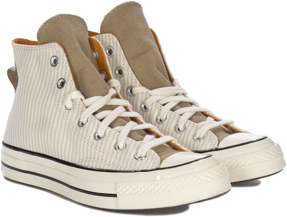Converse Men’s Chuck 70 Hi Hickory Stripe Trainers Desert Sand / Egret / Egret. High shaft shoe made from approximately 50% recycled canvas. Striped print stands out from the plain tongue. A star patch made from 100% recycled polyester on the ankle and a heel loop made from 100% recycled polyester add a new touch to traditional materials. Lacquered white midsole for a classic look OrthoLite insole for added comfort.